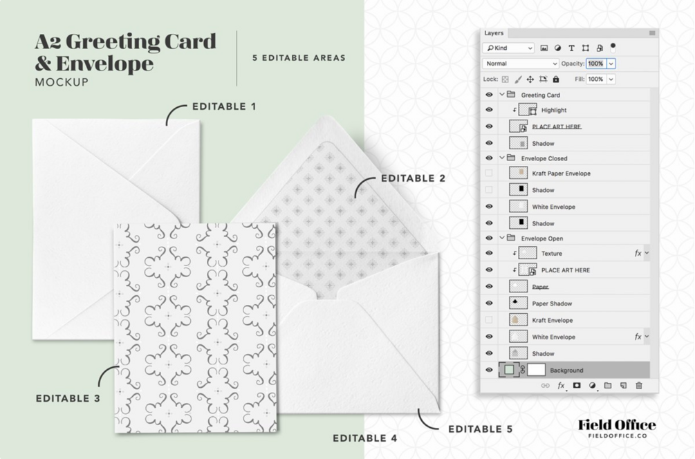 This A2 greeting card mockup is completely customizable for use in your portfolio, on Etsy and other online shops, or to show your newest designs on Instagram and social media. It is flexible enough that it can be used over and over again—change envelope colors, move elements around, swap out the background for an infinite amount of possibilities.