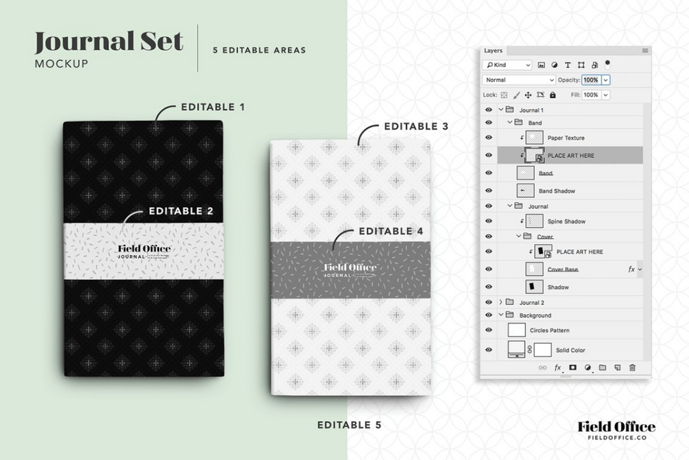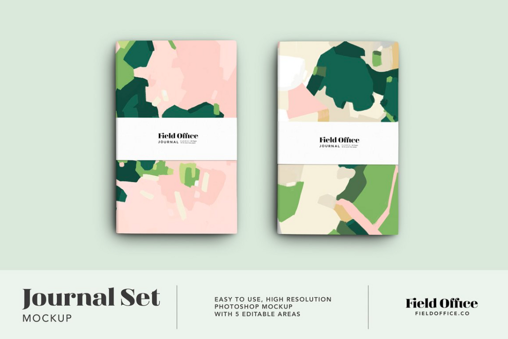 This journal set product mockup is great for showing off surface pattern design, typography, and hand lettering with its 5 completely customizable areas including the journal covers, paper band, and background.
