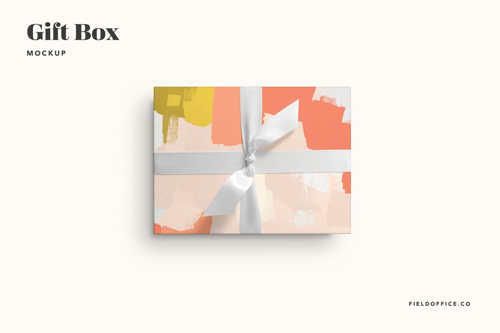 This gift box mockup shows your wrapping paper designs as well as coordinating patterns which can be placed in the ribbon and in the background.