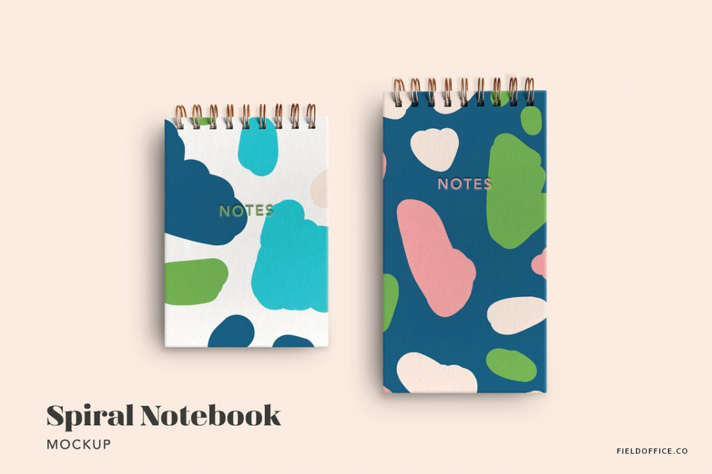 Five files with moveable parts and editable backgrounds. You can spin each notebook around for a vertical or horizontal orientation, change the color of the "notes" letterpress detail on the spiral notebooks (or delete it and design your own label). The backgrounds are also editable so you can change the color or add a coordinating pattern or texture.